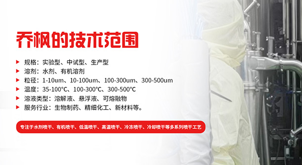上海喬楓實業有限公司,成立于2012年,是從事噴霧干燥設備的研發設計、生產、銷售(小型噴霧干燥機,實驗型噴霧干燥機,35℃低溫噴霧干燥機有機溶劑噴霧干燥機,低溫閉式循環噴霧干燥機超細粉末噴霧干燥機、噴霧冷凍干燥機、真空噴霧干燥機氣流噴霧干燥機,噴霧造粒干燥機,離心噴霧干燥機,沸騰制粒機等)和售后于一體的綜合性公司,本公司現成為一家致力于為生物制藥、精細化工、新能源、陶瓷造粒及食品工程等領域提供全套解決方案的整線交鑰匙工程企業。